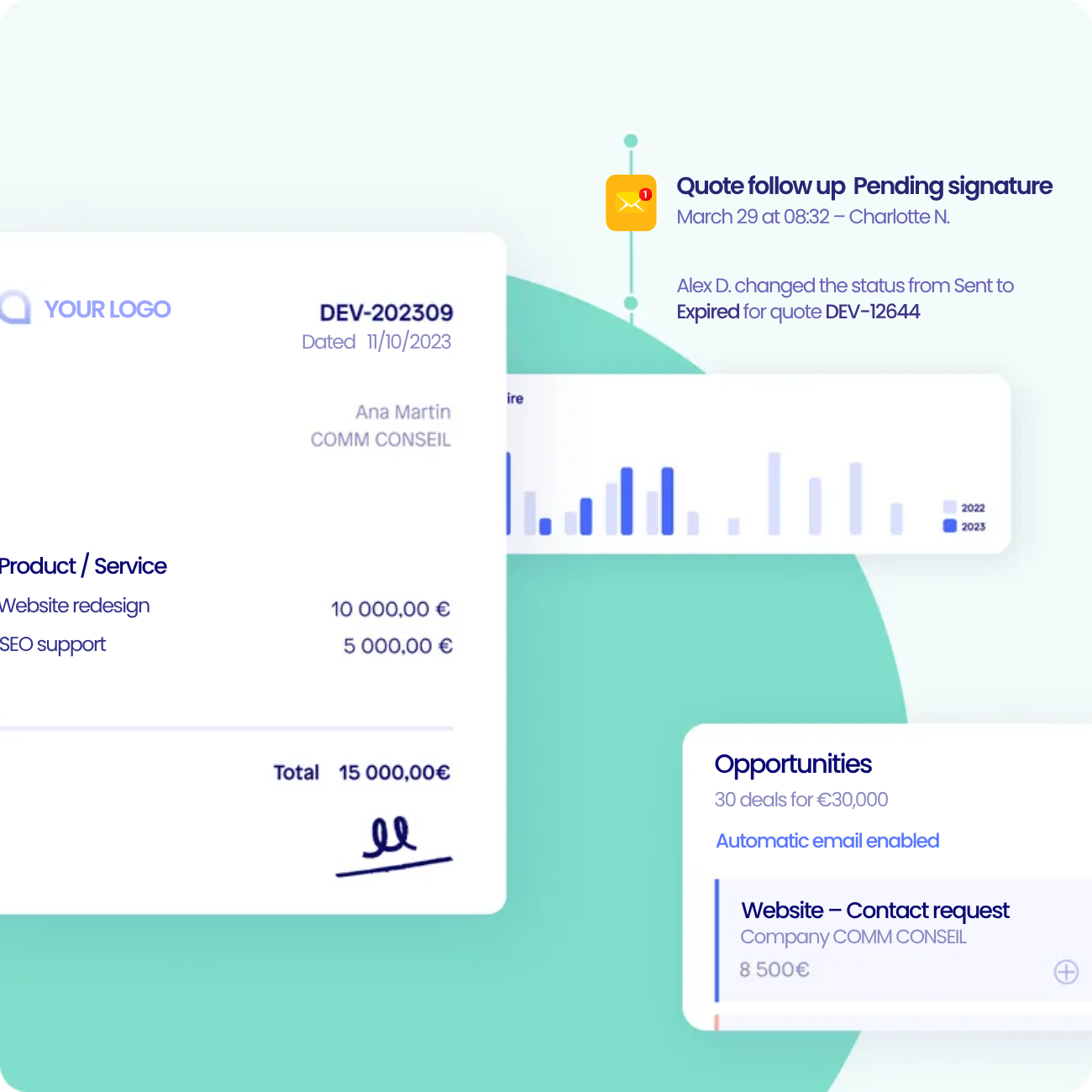 Turn your quotes into invoices with a single click, speed up and secure your payments, and simplify your accounting.