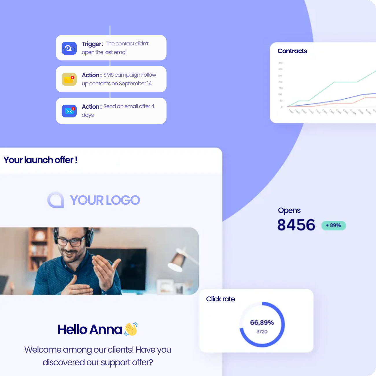 Create superb email and SMS campaigns, automate your marketing actions, measure and optimize your performance.
